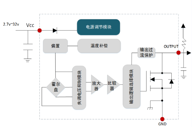 更值得一提的是,如下图所示, KTH2502采用先进的斩波技术(内置零漂移放大器),集成了温度补偿电路,具有小于10µV的失调电压和极低的失调漂移特性,在工作温度范围内有着卓越灵敏度和温度稳定性。其开漏输出级具有高达30mA的灌电流驱动能力,具有抛负载能力和输出短路过流保护功能。2.7~32V的宽工作电压范围,采用SOT-23-3L和TO-92S封装,反接保护电压高达-32V,广泛适用于众多的汽车及工业领域。